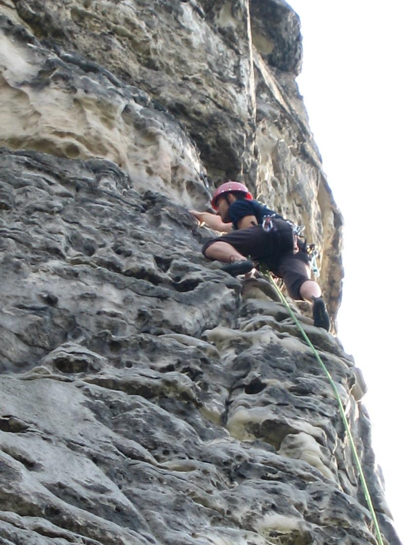 Parkujeme u koupaliště a jako první cíl Gobo vybírá Maják. Má tu pytel v cestě Mézlova cesta VI. Nalézá tedy do toho, první část je v popisu jako mělká spára.. no jestli půl metru je mělké...:o) Chvíli nad tím kroutí hlavou, že co to tam je a že je to divné a kdo to vymyslel a tak podobně, no nakonec se po deseti minutách přešlapování posunuje výše a konečně dolézá ke kruhu... no pro Goba možná rutina, ale já jsem rád, že už tam je..:o) Zbytek cesty uz vypadá lépe, alespoň to tak zdola vypadá. Navazuju se teda a zkouším, co že to ten písek vlastně je... mimochodem se dozvídám, za co že se to držím... nějaké kramle, či krachle, či kdovícotobylo. :o) No ačkoli na druhém, nad tou mělkou spárou taky kroutím hlavou, ale pak to dynamicky rajbasově přelézám. Mezi kruhy a dolez už se mi líbí, nahoře jen nemůžu uvěřit, že jsem to vylezl, moc jsem si nevěřil... a to zatím ještě nevím, co na me Gobo chystá pár hodin potom. Jistím Renču, nějak se s tím maže, podotýká Gobo, v jednom místě dlouho asi přemýšlí, ale nakonec se zelená přilbyčka objevuje u hrany. :o) Jako druhou cestu lezeme hned vedle, také na Maják, tentokráte Údolní VI. Tentokráte ve změněném pořadí, jen prvolezec zůstává stejný. :o) Hezká cesta, žádný kruh, ale celkem dost možností jistění, včetně jedné erární smyce uprostřed. Padesátka lano jen taktak stačí, musím si kousek i popolézt, abych se navázal. Nakonec Gobo dává Německý roh - údolní variantu VI. Lezu za ním, v prostřed cesty je strom, volám dolů na Renču, jestli se ho můžu chytit, že mi tam zavazí... prý ne.. ale začíná potvora pršet, tak se ho chytám a rychle vpřed. Všichni kolem to balí, Renča už to ani nedolézá za námi a my trochu rozmrzelí slaňujeme, vždyt mělo prišet až v neděli!