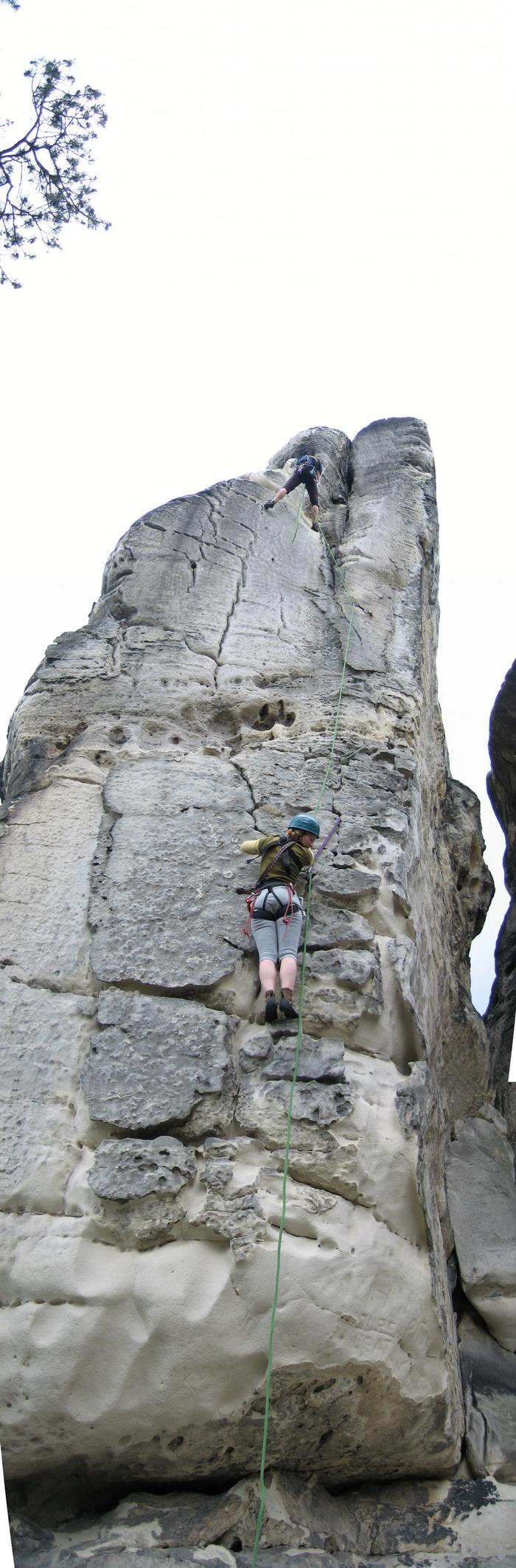 Nedělní ráno nás ale příjemně překvapuje, sluníčko sice moc nesvítí, ale na déšť to zatím taky nevypadá. Dnes směřujeme do jiné oblasti, první věž je Větrník, polezeme Porcálovou stěnu VII. Hmmm, koukám na ten nástup, Gobo říkal že první chyty jsou dost vysoko.. pro Renču asi tak metr nad jejími schopnostmi dosahnout. Gobo ovšem nezklame a několika shyby se přes úvodní pasáž dostává. Navrhuji stavění pro Renču a tak sloužíc jako kus šutru pod nohy, i ona se do cesty dostává. U druhého kruhu Gobo jistí, dobírá Renču a ona pak mě. Jelikož jsem nejvyšší v našem družstvu, přijde mi, že to nebude zase tak hrozné, ten nástup. No ale po 2. pokusu už to tak růžově nevidím.. zapírám se ale a nějak to dávám.. měl jsem více shybovat, ale když já to tak nerad..:o) Cesta je to pěkná výhled taky.. přímo na zámek.