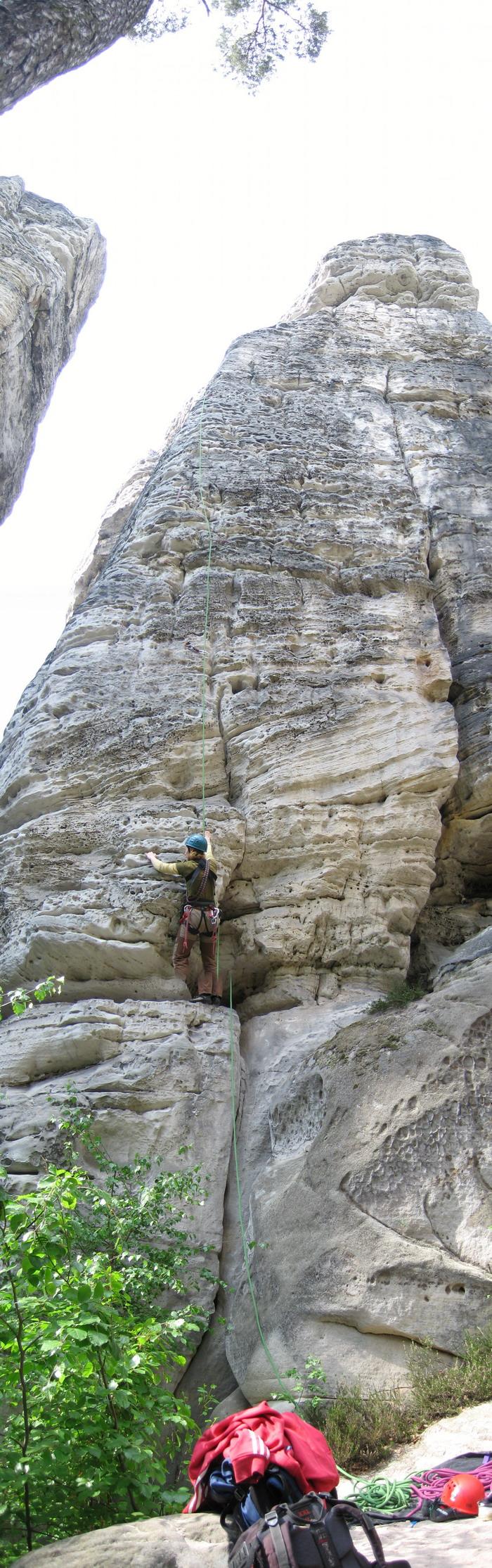 Nedělní ráno nás ale příjemně překvapuje, sluníčko sice moc nesvítí, ale na déšť to zatím taky nevypadá. Dnes směřujeme do jiné oblasti, první věž je Větrník, polezeme Porcálovou stěnu VII. Hmmm, koukám na ten nástup, Gobo říkal že první chyty jsou dost vysoko.. pro Renču asi tak metr nad jejími schopnostmi dosahnout. Gobo ovšem nezklame a několika shyby se přes úvodní pasáž dostává. Navrhuji stavění pro Renču a tak sloužíc jako kus šutru pod nohy, i ona se do cesty dostává. U druhého kruhu Gobo jistí, dobírá Renču a ona pak mě. Jelikož jsem nejvyšší v našem družstvu, přijde mi, že to nebude zase tak hrozné, ten nástup. No ale po 2. pokusu už to tak růžově nevidím.. zapírám se ale a nějak to dávám.. měl jsem více shybovat, ale když já to tak nerad..:o) Cesta je to pěkná výhled taky.. přímo na zámek.