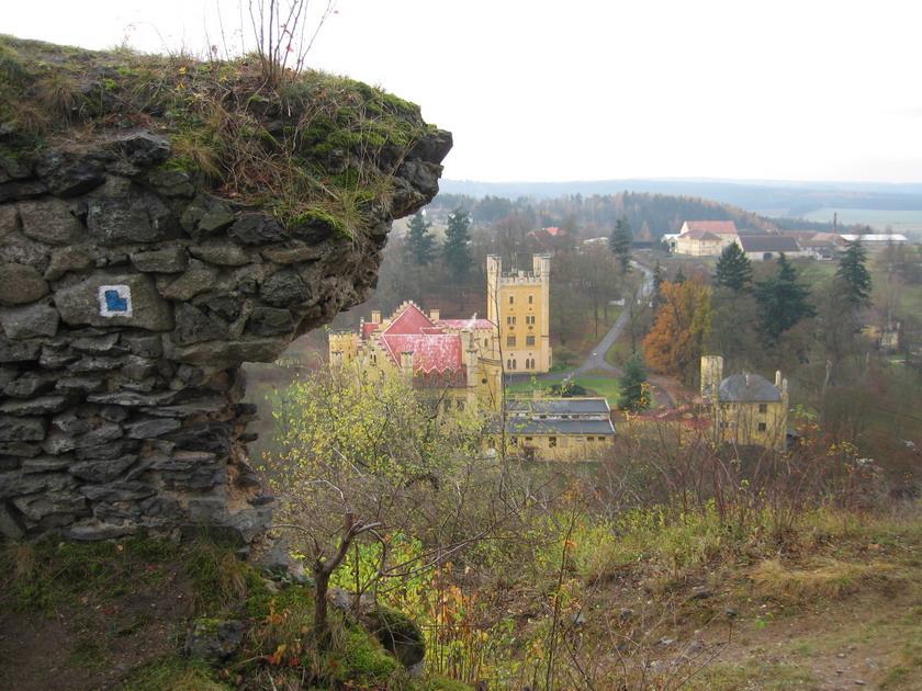 Sobotní ráno nevypadalo nijak lezecky lákavě, v noci poprchávalo, vyrazili jsme tedy na malý výlet. Přes Nečtiny jsme se vydali na zříceninu hradu Preitenstein, asi 2 kilometry dále. V jeho podhradí leží také zámek Netčtiny, z novější doby, kdy hrad byl již nepotřebný a tudíž opuštěn. Samozřejmě, když jsme tam došli, vylezlo sluníčko a opět se příjemne oteplilo. Tedy honem zpět a do stěn! Nebylo by to ale podzimní počasí, aby zrovna když jsme se pod stěnu dostali, nezačalo opět poprchat. Slunce ale svítilo nadále, vykouzlilo tedy jen hezkou duhu a za chvíli bylo opět sucho. Pokračovali jsme v oblasti Stěny, tentokráte jsme lezli Zelenou spáru 5+, Skaláckou 6- a nakonec v oblasti Myší díry Kouzelnou 6+. Tu jsem ovšem opět nedal, tedy ten jeden klíčový krok u druhého kruhu. Gobo prohlásil, že mu asi ztloustly prsty, protože je nemohl dostat do spáry, já měl podobný problém. Zato Renča si libovala, jaká je ta spára akorát a jak hezky bere. Nebrala asi ale dlouho, o jejích výkřicích o metr výše se tu nebudu rozepisovat, ale dole v údolí si asi museli říkat, že si to tam na kopci někdo pěkně užívá.:o)