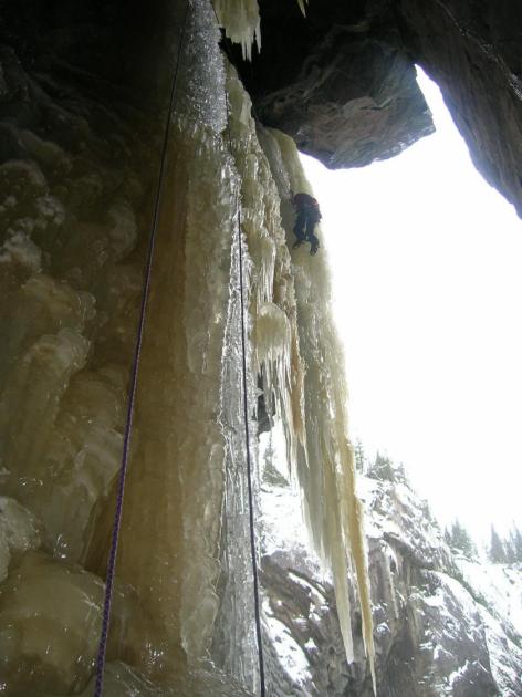 Ze štandu v jeskyňce jsem pozoroval, jak se Honza drápe pod strop, odpočívá pod záclonou a pouští se do klíčového traverzu se zajímavým překrokem. Šrouby sázel hustě, abych se zbytečně nevybál v pendlu. Po hromovém zařvání Pojď!! se pouštím do ledových píšťal s křehkými kudrlinkami na povrchu. Vysekané dírky i přírodní struktura ledu dovoluje často jen věšet cepíny, zato s mačkami je to horší. Ještěže za námi nikdo neleze, asi bych ho umlátil padajícím ledem.