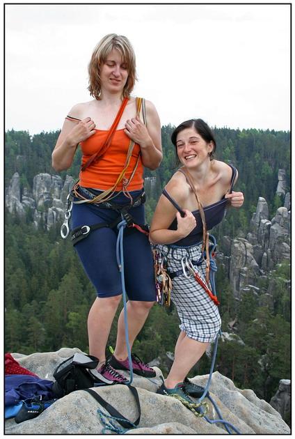 Rajbákový koutek Brto s trochou funění a morální podpory spolulezkyň dobyl, pošlapal při stavění Evuše břicho i ramena a už byl na vrcholu, my pak chvíli po něm. Nahoře jsme neodolali a nafotili první snímky pro Sejkovu plánovanou outdoorovou porno stránku - ovšem pouze s lehkým erotickým nádechem, protože dole bylo plno turistů. Avšak lezci žádní. Trochu nám to přišlo divné, ale pak jsme si řekli že asi všichni jeli lézt do Arca a pískařská klasika že většinu překližkářů netáhne.
