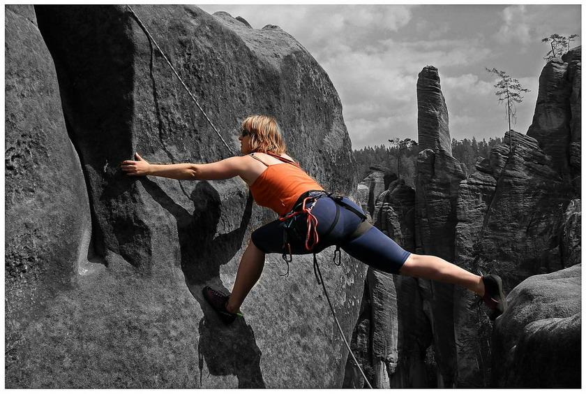 Nejsme žádní Úžasňákovi takže jsme se rozhodli pro klasickou cestu, která začíná v nejtemnějším a nejužším místě komínu mezi Milenci (brr, ta zima!!!). Následuje asi 40 metrové lezení komínem (jak jinak)- nejdřív je docela široký ale pak se hodně zúží a člověk se zase kroutí a sápe jak žížala, funí a sípe jak při mnohačetném orgasmu a oddechuje jak po maratonu. Stručně řečeno, docela síla pro lidi co jsou namlsaní ze Saska (druhý den nás bolely ruce, nohy, zadek, prostě všechno). Ale je to zábava.