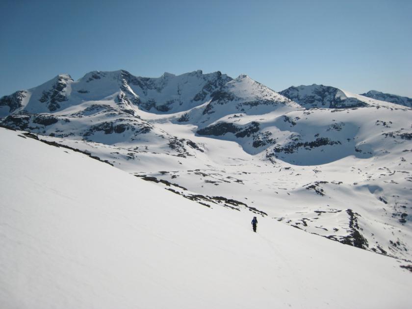 Fannaraaken byl jen náš. Počasí opět zaskočilo. Modrá obloha, bezvětří. Potíme se jak koně. Překonat jedenáct set metrů převýšení nám trvá dobrých pět hodin. Nahoře nevěřícně zíráme na plyšového zajíčka, kterého někdo naschvál postavil na vrcholovou převěj, aby vítal vyřízené skialpinisty přitroublým úsměvem. Sjíždíme rozbředlým pomalým firnem, sluníčko sluní, johoho, to jsou pak večer spáleniny jedna báseň.