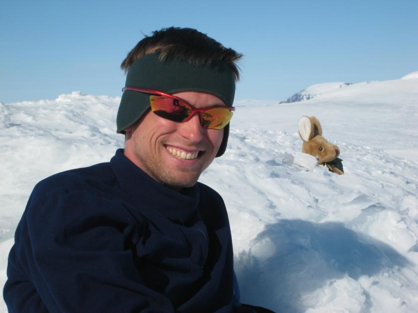Fannaraaken byl jen náš. Počasí opět zaskočilo. Modrá obloha, bezvětří. Potíme se jak koně. Překonat jedenáct set metrů převýšení nám trvá dobrých pět hodin. Nahoře nevěřícně zíráme na plyšového zajíčka, kterého někdo naschvál postavil na vrcholovou převěj, aby vítal vyřízené skialpinisty přitroublým úsměvem. Sjíždíme rozbředlým pomalým firnem, sluníčko sluní, johoho, to jsou pak večer spáleniny jedna báseň.