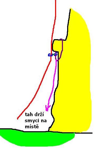 a) Nauč se smyčkovat, vole! Tedy neprasit, ale zlepšit své technicko-manuálně-vynalézačské schopnosti. Uzlíky všech velikostí. Tuhá smyčka kevlarka pro provazování zapeklitých hodin. Dobrou fintou (kromě tajemného pískovcového frienda) je tažená smyce na nevýrazném hrotu, bude se vám hodit třeba v převísku pod velkými hodinami v krásné Jecelínově cestě na Strubichovu věž ve Skaláku. Tedy prvolezec vyrazí na jednom konci lana navázán, a druhý konec lana si s sebou nese pro vytvoření tahu. Doleze k hrotu a položí smyci, která by unesla hejno verlyb, kdyby nehrozilo, že se vyzvoní. Proto použijeme s sebou nesený druhý konec lana k vytvoření tahu, který smyci drží na místě. Z mizerné smyce se stane tutovka, a nad ní chyty jakoby povyrostou a koeficient tření výrazně vzroste. Sportovní hodnota zůstává. Viz obrázek 1.