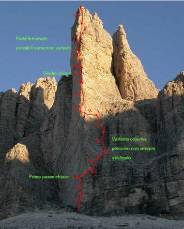 Další délky, ačkoliv jsou hodnoceny jako lehké, zas tak úplná sranda nejsou. Skála je občas dost lámavá a jen velmi málokdy narazíte na skobu. Navíc od čtyřky výš se po cestě pravidelně potkáváte s vypečenými bříšky a malými převísky, které dokáží dát slušně zabrat. Italové za námi znají v cestě zkratku, kterou ušetří jednu délku a dostávají se tak před nás. Postupně se nám také začíná zdát, že cesta zrovna dvakrát neodpovídá nákresu. IV+ ková pasáž je nějaká delší než by měla být, po spárkách z nákresu ani vidu ani slechu. Spíš je to pěkné lezení po pevných vápencových madlíčkách, občast trochu převislé. Vtipné je na tom to, že tady nejsou žádné skoby a není kam co zakládat, takže Bárt přelezá délky buď jen s velmi málo jištěním, nebo ty kratší dokonce v jednom dlouhém odlezu téměř od štandu ke štandu. Začínáme být nervózní z dalších těžkých pasáží, které mají přijít, a také z toho, zda budeme dost rychlí. Počáteční těžký kout už ale máme dávno za sebou a počasí nám také opravdu přeje.