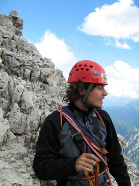 Dál pokračujem celkem poctivým a hodně exponovaným traverzem doleva. Potom dalších V+ stěnou přímo vzhůru, semtam skoba. Délka končí na velké polici, kde si konečně po několika hodinách přešlapování na poličkách můžu sednout. Je krásné počasí, ale už jsme taky pořádně unavení. Zbytkový adrenalin z nejtěžší délky úplně vyprchal a doléhají na nás noční čtyři hodiny spánku. Teď už chceme jen co nejrychleji nahoru, máme toho plný zuby. Italové už jsou dávno v prachu. Něco sníme, popijem, vyfotíme. Natočíme i kraťoučký videíčko. Další délka IV+ pro Bárta. Nejdřív hustej převísek, potom lámavá skála. Ja mu dám IV+, Comicimu jednomu! Bártovi to trvá dlouho, poctivě jistí a pak nemůže najít štand. Nakonec zaštanduje na friendu a vklíněncích. Skutečný štand nalézá až později, když už má vše vybudováno. Dál lezu já, procvakám tři skoby opravdového štandu a chystám se do poslední délky V+. Jestli dáme tohle, vrchol už máme opravdu na dosah. Nakonec má být ale docela veselo. Nad štandem nacházím už jen jednu skobu a s pořádným odlezem dolézám na malou poličku, nad kterou se tyčí další stěna, očividně dost lámavá a skoby nikde. Kurva, přece to tady někde musí bejt, už jsme tak blízko. Krabím krokem se posunuju po poličce zleva doprava a zpět a vyvaluju oči abych snad našel kudy to vede. Ale nikde nic. Kurva. Jenže velkej odlez dolu bych asi neslez, na to je to dost těžký a zajistit na poličce ani nikde jinde se nedá. Poslední možnost je odtraverzovat doprava do hajzlu k velkým blokům šutrů, které slibují lehký, ale lámavý terén. Zajistit se tady můžu tak maximálně pocitem že sem borec a nespadnu. Vyplazím se na pár schodovitých stupňů a k velké radosti najdu štand na dvou skobách. Ještě pro jistotu obhodim smyčkou hrot co mám u nohou, jedna skoba nevypadá moc dobře. "Vole, tak jsem ňákej štand našel". Fuj, mám toho dost. Nejištěnou V+ pasáž s batohem a kyvadlem jako prase Bártovi fakt moc nezávidim. Když štastně doleze za mnou, máme za sebou 12 délek a nad námi se tyčí poslední pořádně dlouhá lehká, ale nejasná délka na vrchol. Tahání už mám za dnešek fakt dost. Chtěl bych se nechat v klidu dobrat na vrchol a mít svatej pokoj. Oťukávám jestli by se Bárt neujal vedení. "Hele, to už je lehký, jdeš?". "Ani hovno, jdi ty." No, tak teda jdu. Skoba samozřejmě žádná, je to lehký, ale už mám nervy v kýblu a občas to nejde moc zajistit. Buď neni co kam strčit nebo se to láme. Kličkuju, abych našel co nejlehčí terén. Na štand za námi dolézají dva Angličani a s pravým britským klidem čekají, až odlezeme. Já mám zatím radost z každého založeného čoku. Lezu dlouho, mám pocit, že mi za chvíli musí dojít lano. "Kolik lana?". Nic. "Kolik lana?". Nic. "Ty debile, kolik mám kurva lana?". "Já nevim, já to nepoznám", hbitě odpovídá chovanec Jedličkova ústavu Jan Bartas. "Vystačí to nebo mám štandovat?" Nebylo tam moc kde, tak lezu dál. Po pěti metrech, na dosah od vrcholu nalézám super místo a buduju štandík. Metodika na výbornou, dva tutový čoky a jeden friend na tah dolů, pojistit zespoda čokem na tah zdola a vypnout centrální karabinu smyčkou. Poprvé v životě tedy štanduju ve stěně 300 metrů nad zemí na vlastním. Za štand bych ale dal krk, takovej by nepostavil ani Radan Kuchař. Jenže do vlastního štandu se nesedá a tak stojim jako dement rozkročenej nad udolím a všelijak se kroutim, aby mě nebolely nohy. Po notné chvíli doleze Bárt a triumfální 10-ti metrovou délkou za dvě finišuje naší první horskou šestku.