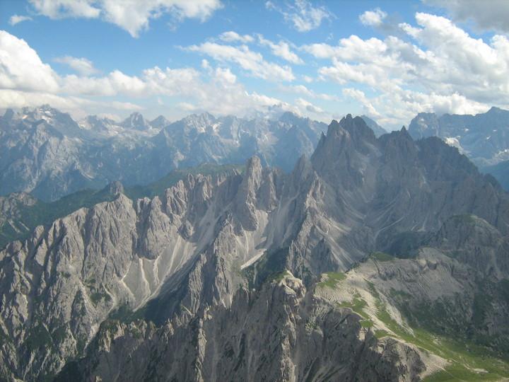 Další délky, ačkoliv jsou hodnoceny jako lehké, zas tak úplná sranda nejsou. Skála je občas dost lámavá a jen velmi málokdy narazíte na skobu. Navíc od čtyřky výš se po cestě pravidelně potkáváte s vypečenými bříšky a malými převísky, které dokáží dát slušně zabrat. Italové za námi znají v cestě zkratku, kterou ušetří jednu délku a dostávají se tak před nás. Postupně se nám také začíná zdát, že cesta zrovna dvakrát neodpovídá nákresu. IV+ ková pasáž je nějaká delší než by měla být, po spárkách z nákresu ani vidu ani slechu. Spíš je to pěkné lezení po pevných vápencových madlíčkách, občast trochu převislé. Vtipné je na tom to, že tady nejsou žádné skoby a není kam co zakládat, takže Bárt přelezá délky buď jen s velmi málo jištěním, nebo ty kratší dokonce v jednom dlouhém odlezu téměř od štandu ke štandu. Začínáme být nervózní z dalších těžkých pasáží, které mají přijít, a také z toho, zda budeme dost rychlí. Počáteční těžký kout už ale máme dávno za sebou a počasí nám také opravdu přeje.
