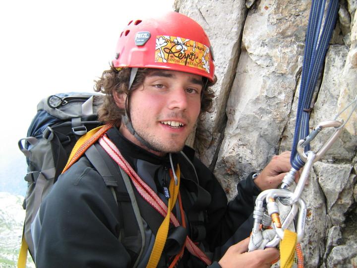 Začínáme být trochu unavení, máme za sebou osm délek poctivého lezení. Na štandu pod další délkou asi půl hodiny čekáme, než odlezou obě italské dvojky. Přešlapuju na štandu jako blbec abych už už mohl do převislého koutku nalézt a vyzkoušet, jestli na nejtěžší místo cesty máme nebo jestli bídně umřeme ve stěně. V mojí vrozené škodolibosti mě potěší, že poslední z italů na druhém v délce potupně hákuje. Nadmu se tedy jako koza že já to jako určitě dám čistě. Ještě načechrám peří a jdu. Nejdřív slušný odlez, cvakout dvě skoby aby byla jistota a už je tu první těžké místo. Nesmimháknout, nesmimháknout. Plotna přede mnou je ale hladká a nevím jak dál. Nakonec najdu jeden dobrý stup. Je docela vysoko, nakopu na něj nohu. Pak dva rychlé vratké kroky na tření na oklouzaném dolomitu a je to z půlky za mnou. Skob je tu všude spousta, není se čeho bát. Nalézám do kouta a s dobrou náladou přelézám vytrvalostní šestkovou pasáž po madlech. Tak to mám přecijen čistě. Štanduje se v půlce monumentálního koutu hezky pěkně ve visu na asi pěti skobách. Věším se do slušně vypadajících erárních smyček a pro jistotu to nějak prošmodrchám jednou stodvacítkou. Expozice jako prase. Pod nohama ubíhá jedna stěna převislého koutu, a pod zadkem už máte jenom prázdnotu a díru asi 200 metrů až na podlahu. Do toho občas zavržou erární smyce, ve kterých sedíte. Dobírám Bárta s batohem. V plotničce sice jeden krok zahákuje, ale vyčerpávající madla v koutě přeleze i s tréninkovou zátěží čistě.