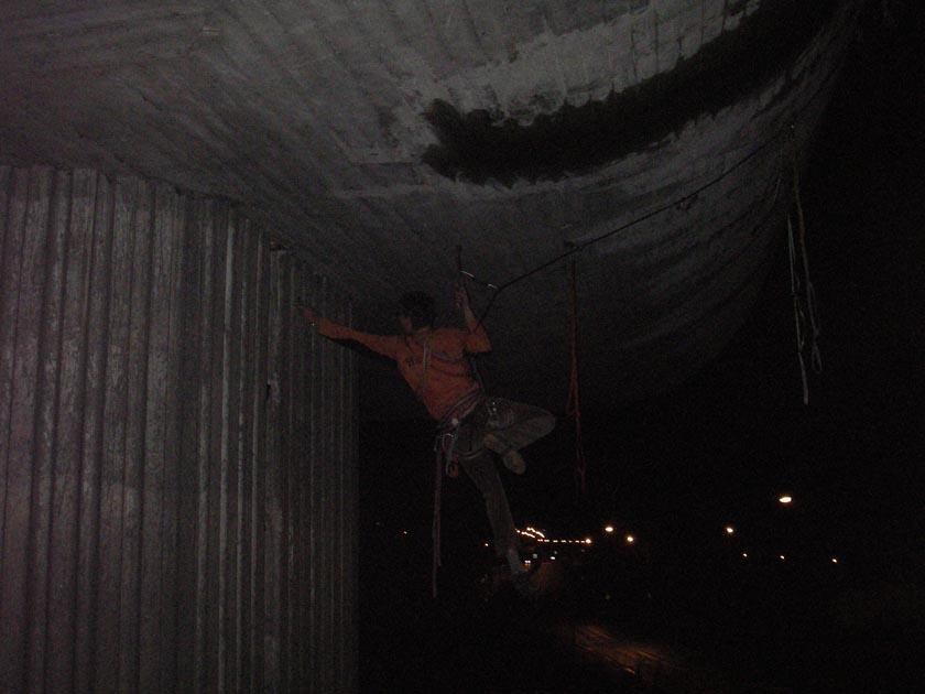 V mezičase, co jsem lezl, se nám taky obecenstvo (fotograf Tomáš, kterého s sebou vzal Mik) rozroslo o další osobu. Byl to nějaký děda s kořalkou, který patrně bydlel v nedaleké boudě či krabici. Dělal společnost Tomášovi při focení a údajně stejně jako Tomáš projevoval starosti jak o naše duševní, tak fyzické zdraví. Abychom se v případě dvanáctimetrového pádu ze stropu nepotloukli, lanařil Tomáše, aby s ním odněkud dovlekl asi 20 čísel tlusté kusy izolace jako doskočiště, čemuž Tom naštěstí odolal. :-) Jinak byl děda vděčný pozorovatel a vydržel sledovat celé představení až do našeho odchodu o dvě hodiny později.