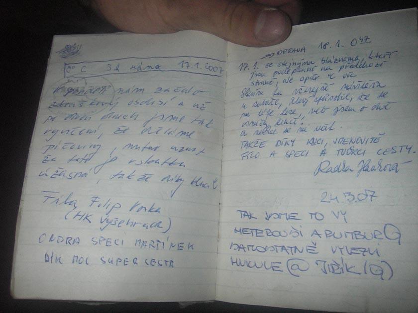 Mik přelezl pasáž po okapu volně jak to má být a ve stropě hákoval jen s jedním žebříkem. Bouldřík nahoře překonal s elegancí hodnou horního jištění. Jinak techniku hákování jsme oba měli patrně stejně mizernou, ale zas někdy ten trénink na yosemitský A5ky začít musíme, žejo. Na vrchol jsme si potom vytáhli foťák, udělali vrcholové foto a nafotili pár stránek z knihy. Byla tak ze třetiny popsaná a zápisy byly poněkud výřečnější než je ve vrcholovkách obvyklé. Občas nechyběly vlepené obrázky s logy oddílu, krátké popisy výstupu. Někteří lezci pokoření Hroší lázně očividně pojali jako symbolické vyjádření odporu k někdejší ruské nadvládě, a to často dost nevybíravě a vulgárně. :-) Nakonec jsme posílili důvěryhodnost staré slaňovací smyčky jednou prchačkou navíc, slanili jsme a potom už šupky dupky do hospody.