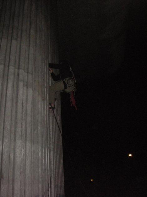 V mezičase, co jsem lezl, se nám taky obecenstvo (fotograf Tomáš, kterého s sebou vzal Mik) rozroslo o další osobu. Byl to nějaký děda s kořalkou, který patrně bydlel v nedaleké boudě či krabici. Dělal společnost Tomášovi při focení a údajně stejně jako Tomáš projevoval starosti jak o naše duševní, tak fyzické zdraví. Abychom se v případě dvanáctimetrového pádu ze stropu nepotloukli, lanařil Tomáše, aby s ním odněkud dovlekl asi 20 čísel tlusté kusy izolace jako doskočiště, čemuž Tom naštěstí odolal. :-) Jinak byl děda vděčný pozorovatel a vydržel sledovat celé představení až do našeho odchodu o dvě hodiny později.