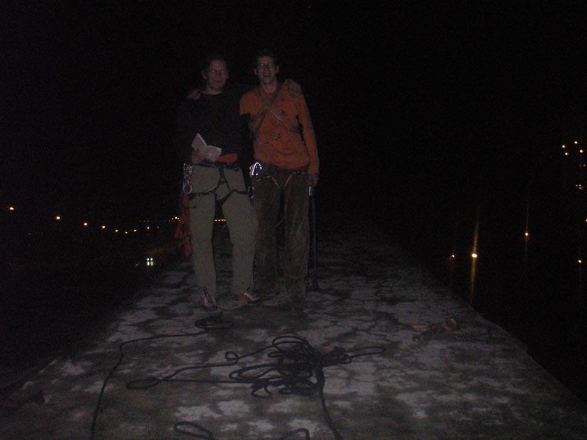 V mezičase, co jsem lezl, se nám taky obecenstvo (fotograf Tomáš, kterého s sebou vzal Mik) rozroslo o další osobu. Byl to nějaký děda s kořalkou, který patrně bydlel v nedaleké boudě či krabici. Dělal společnost Tomášovi při focení a údajně stejně jako Tomáš projevoval starosti jak o naše duševní, tak fyzické zdraví. Abychom se v případě dvanáctimetrového pádu ze stropu nepotloukli, lanařil Tomáše, aby s ním odněkud dovlekl asi 20 čísel tlusté kusy izolace jako doskočiště, čemuž Tom naštěstí odolal. :-) Jinak byl děda vděčný pozorovatel a vydržel sledovat celé představení až do našeho odchodu o dvě hodiny později.