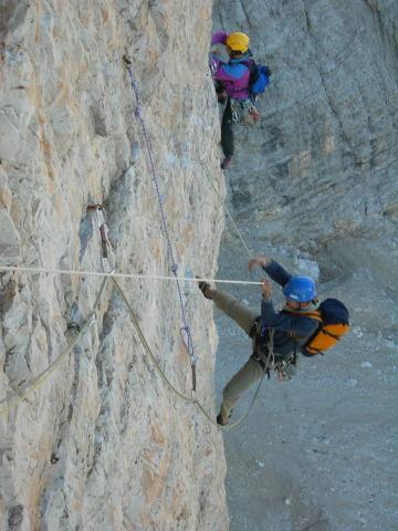 Jistím Míru na balkónku, odkud se doleva táhne výrazná police. Končí hranou, dál nedohlédnu. Zde Cassin našel v roce 1935 (!!!) klíč ke vstupu do severní stěny, jenž v přímém směru blokuje pás střechovitých převisů. Míra odcupitá po polici 15 metrů ode mne, udělá pár kroků kolmo vzhůru po lištách a zmizí za hranou. Psáno jest za 7a, ale není ani náhodou. Stanoviště je krásně exponované, ve dvou nýtech, jako po většinu cesty. Lana visí volně dolů a i kdyby sahala až na zem, není místa, kde by se přiblížila ke skále. Čím níže, tím je stěna vzdálenější. Jen chvíli si vychutnáváme společný vis. Přichází druhá těžká délka. Po pár krocích berou moje ideály čistého lezení za své. Osmičky na OS běžně nelezu, natož v horách. K tomu nám na záda dýchají Italové a za nimi naši známí Španělé. "Hola, amigo!", haleká jeden, který mě poznal. Já ti dám amigo, myslím si a vzpomínám na náš noční sestup z Cimy Grande.
