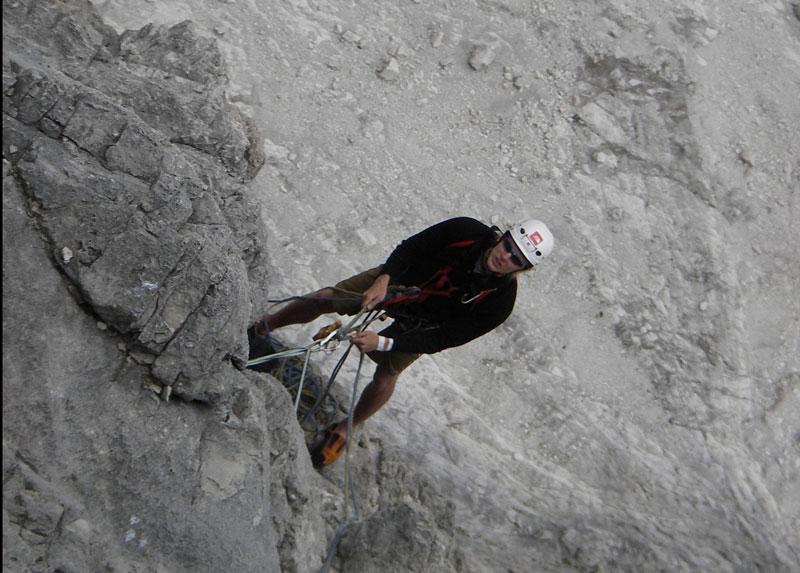 Po pár chvílích už za ním dolézám na pěkný jeskynní štand a přebírám vedení. Hned nad výlezem z jeskynního převisu do hladkého kouta mě čeká další hákovací místo. Cvkanu tedy jednu z mnoha nabízených skob a rovnou se pouštím do lezení. V pravé ruce slušnej bočák, v levé docela dobrá lišta na půl článku prstu. Opřu nohu do protěší stěny, že udělám celkem jednoduchý zdvih do dalšího chytu, však co se nestane, noha mi z té (mimochodem opravdu velmi hladké) plotny ujíždí a já si zkoušim, jaké to je, vlát na těch výše zmíněných chytech cca 200 m nad údolím. Sám chvíli žasnu, co to vlastně držim za jebky, ale jelikož je pořád ještě držím a nesedim svědomitě jistícímu Mikovi za krkem, nic nelením a tzv. "stylem mickey mouse" se dostávám přes inkriminované místo. A jako důkaz, že to opravdu nebylo žádné madlo, pak na prstech levé ruky nacházím lehce naříznutou kůži právě v polovině posledního článku. Následuje padesátimetrová délka nádherného exponovaného lezení s ještě několika šestkovými (podle mého subjektivního názoru možná i trochu těžšími) místy a krásný vzdušný štand pod poslední pětkovou délkou. Tu už Mik suverénně vyvádí, takže po pár chvílích svačíme pod vrcholem a poté i dolézáme (resp. spíše docházíme) na druhou nejvyšší horu brentských Dolomit, Cimu d Ambiez.