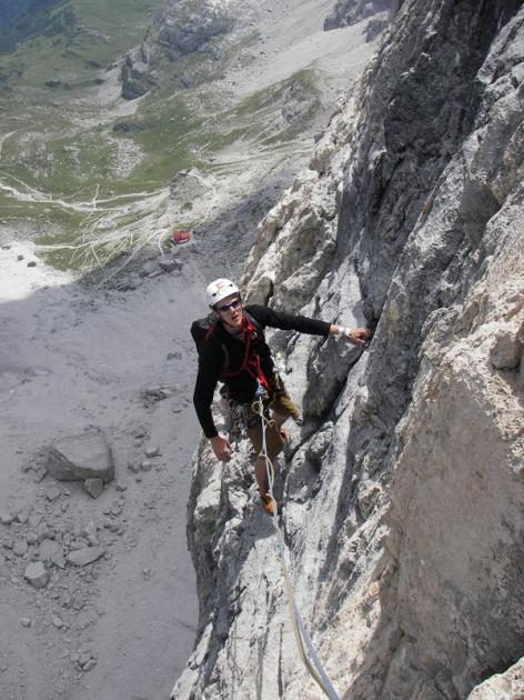 Po pár chvílích už za ním dolézám na pěkný jeskynní štand a přebírám vedení. Hned nad výlezem z jeskynního převisu do hladkého kouta mě čeká další hákovací místo. Cvkanu tedy jednu z mnoha nabízených skob a rovnou se pouštím do lezení. V pravé ruce slušnej bočák, v levé docela dobrá lišta na půl článku prstu. Opřu nohu do protěší stěny, že udělám celkem jednoduchý zdvih do dalšího chytu, však co se nestane, noha mi z té (mimochodem opravdu velmi hladké) plotny ujíždí a já si zkoušim, jaké to je, vlát na těch výše zmíněných chytech cca 200 m nad údolím. Sám chvíli žasnu, co to vlastně držim za jebky, ale jelikož je pořád ještě držím a nesedim svědomitě jistícímu Mikovi za krkem, nic nelením a tzv. "stylem mickey mouse" se dostávám přes inkriminované místo. A jako důkaz, že to opravdu nebylo žádné madlo, pak na prstech levé ruky nacházím lehce naříznutou kůži právě v polovině posledního článku. Následuje padesátimetrová délka nádherného exponovaného lezení s ještě několika šestkovými (podle mého subjektivního názoru možná i trochu těžšími) místy a krásný vzdušný štand pod poslední pětkovou délkou. Tu už Mik suverénně vyvádí, takže po pár chvílích svačíme pod vrcholem a poté i dolézáme (resp. spíše docházíme) na druhou nejvyšší horu brentských Dolomit, Cimu d Ambiez.
