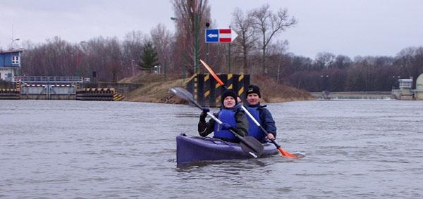 V Obříství objíždíme ostrov. Jedeme až k plavební komoře. Vytahujeme kajaky na břeh a komoru obnášíme. "Nechcete proplavit?" hlaholí na nás obsluha z okénka dispečerské věže. S díky odmítáme. Nejsme si jisti, že bychom neskončili při vypouštění plavební komory v ledové vodě. Navíc se aspoň trochu protáhneme.