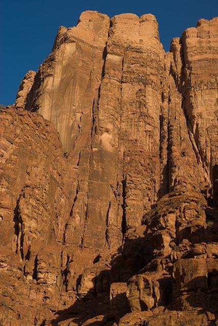 Ráno nám místní lezecký kápo zapůjčuje na celých 10 dní průvodčíka, stavíme stan v kempu, chvíli se rozkoukáváme a jdeme lézt. Na rozlez zkoušíme na East Dome of Jebel Rum čtyřdélkový Mumkin (5+), ale po dvou délkách to je celkem nuda a tak lezeme Flight of Fancy (5+, 5-, 6a, 6b, 5+, 5+), což graduje parádním sokolíčkem a skvostnou koutovou trhlinkou na půl článku. Na dolezení ještě Troubadour (5, 3, 6a+), kolmá koutová spára jak podle pravítka a za odměnu lahodná večeře v místní špeluňce.