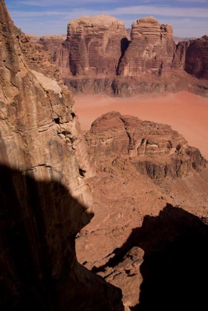 Ráno nám místní lezecký kápo zapůjčuje na celých 10 dní průvodčíka, stavíme stan v kempu, chvíli se rozkoukáváme a jdeme lézt. Na rozlez zkoušíme na East Dome of Jebel Rum čtyřdélkový Mumkin (5+), ale po dvou délkách to je celkem nuda a tak lezeme Flight of Fancy (5+, 5-, 6a, 6b, 5+, 5+), což graduje parádním sokolíčkem a skvostnou koutovou trhlinkou na půl článku. Na dolezení ještě Troubadour (5, 3, 6a+), kolmá koutová spára jak podle pravítka a za odměnu lahodná večeře v místní špeluňce.