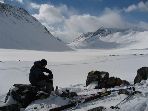 Po dlouhém rozmýšlení jsme s Bárou zavrhli polárnický přechod Hardangerviddy a vyrazili na skialpy do Jotunheimenu. Trošku nás zneklidňovalo, že celou cestu bylo krásné počasí a dokonce i hrozilo spálení od sluníčka. K velkému překvapení nás hezké počasí provázelo do prvních stoupání z Gjendesheimu, cestou přes zamrzlé jezero Russvatnet až k svačinové přestávce. Pak se ale vrátilo do norského normálu. Sluneční brýle jsme zaměnili za lyžařské a spokojeně pizděcem pokračovali výš a výš a ještě výš a pořád dál a dál a dál ... (kdo byl na Ploské, pochopí). Úplně zničení, po šestadvaceti kilometrech šoupání, jsme se uložili na chatě Glitterheim Přímo pod druhou nejvyšší horu Norska (a když se započítá i sněhová převěj, je dokonce Glittertind nejvyšší!).
