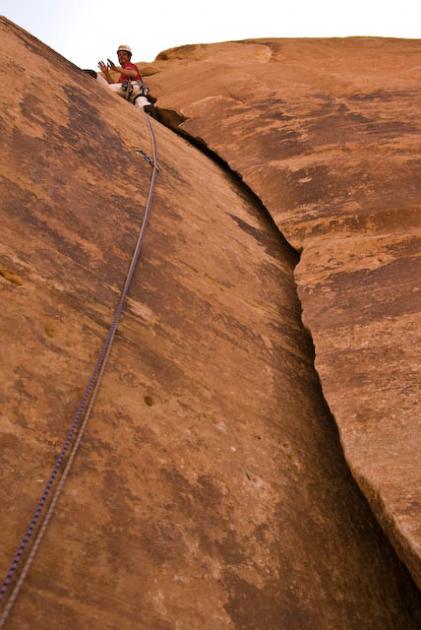 3. den jdeme na The Beauty (5+, 6a, 5+, 5, 5+, 4+, 200m 2-3) na Jebel um Ejil. Samotný více než hodinový přístup je hodnotný a dobrodružný, bloudění systémem údolíček a průchodů, 6m trojkovým komínem s baťohem na zádech, nakonec traverz v rajbáku 30m nad zemí, kus slézt, 2m seskočit a už jsme ve správném kaňonu. The Beauty je super: parádní sokolíček, pak kus širočiny a položené prstovky a nakonec šavlovitá široká spára. Průvodce doporučuje vzít do širočiny největšího frienda a posouvat ho během lezení před sebou, my ho ovšem nemáme, tak nakonec zakládám frienda do skuliny asi v 6m a zbytek sólo. Se spálenými rypáčky se vracíme do kempu, snad zítra Viktor nezapomene opalovací krém.