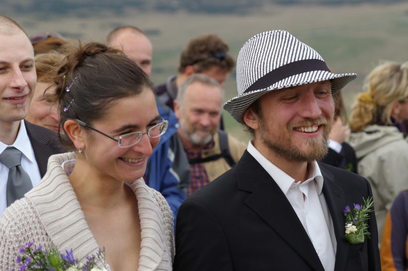 Obřad byl velmi dojemný, leckomu ukápla i slza (včetně samotné nevěsty, kterou už jsme viděli plakat vzteky při náročných sjezdech nebo výstupech, ale v takto romantické poloze ji opravdu neznáme)a po té se celý průvod vydal zdolat nedalekou Sněžku ještě ve svatebních oděvech (ano ano, Kniha tam vylezla ve své dlouhé bílé princeznovské sukni a botičkách, pouze ta goretexová bunda kazila výsledný dojem).