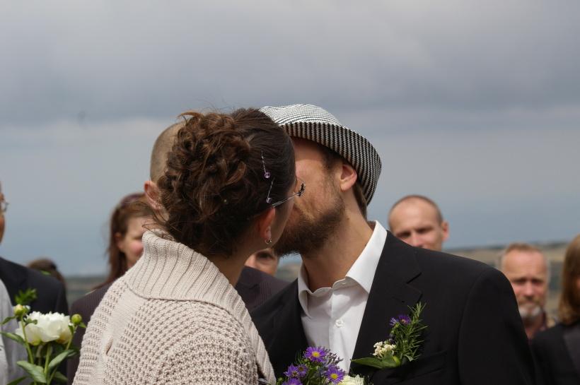 Obřad byl velmi dojemný, leckomu ukápla i slza (včetně samotné nevěsty, kterou už jsme viděli plakat vzteky při náročných sjezdech nebo výstupech, ale v takto romantické poloze ji opravdu neznáme)a po té se celý průvod vydal zdolat nedalekou Sněžku ještě ve svatebních oděvech (ano ano, Kniha tam vylezla ve své dlouhé bílé princeznovské sukni a botičkách, pouze ta goretexová bunda kazila výsledný dojem).