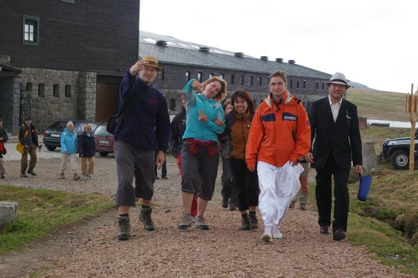 Obřad byl velmi dojemný, leckomu ukápla i slza (včetně samotné nevěsty, kterou už jsme viděli plakat vzteky při náročných sjezdech nebo výstupech, ale v takto romantické poloze ji opravdu neznáme)a po té se celý průvod vydal zdolat nedalekou Sněžku ještě ve svatebních oděvech (ano ano, Kniha tam vylezla ve své dlouhé bílé princeznovské sukni a botičkách, pouze ta goretexová bunda kazila výsledný dojem).