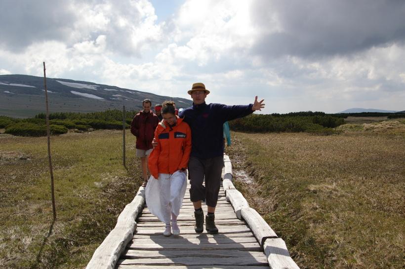 Obřad byl velmi dojemný, leckomu ukápla i slza (včetně samotné nevěsty, kterou už jsme viděli plakat vzteky při náročných sjezdech nebo výstupech, ale v takto romantické poloze ji opravdu neznáme)a po té se celý průvod vydal zdolat nedalekou Sněžku ještě ve svatebních oděvech (ano ano, Kniha tam vylezla ve své dlouhé bílé princeznovské sukni a botičkách, pouze ta goretexová bunda kazila výsledný dojem).