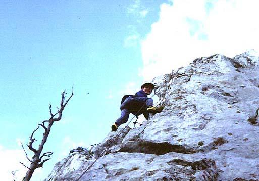 Kupodivu to jde docela rychle, protože drsný vápenec nabízí dost chytů i pro malé ruce. Ve třetí délce ovšem chyty chybí, a tak se traverz přes hladkou plotnu odehrává pomocí skoby a kyvadlového traverzu.