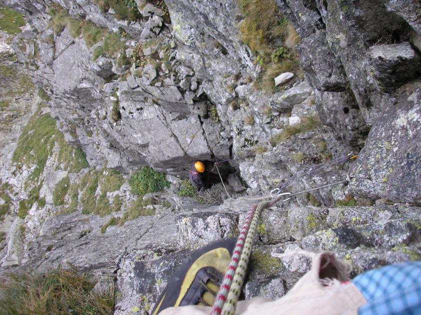 Ráno po šesté vstáváme, snídáme a vyrážíme s popisem: "Prostě spárou vprostřed štítu" Bělovodskou dolinou nahoru. Od Litvorového plesa hledáme přístup. Prý to má být hodně vlevo. Nakonec se, dokonce správně, rozhodujeme pro slizký kout. Po včerejším dešti je opravdu vlhký. V klíčovém místě teče potok. Tohle volně nepůjde, tak budujeme štand navazujeme se a skrz potok nakonec vlézáme do druhé části koutu. Vytočíme celou délku lana. Naštěstí to stačí skoro na konec koutu. Nadáváme jaká je to Turkovina a pokračujeme již nenavázaní ke zbytkům sněhu. Moc ho už není, a odtrhovou trhlinou se dá pohodlně dojít k místu odkud to jde po skále nahoru. Vítr občas rozežene mlhu, takže volně dolézáme až k začátku spáry.