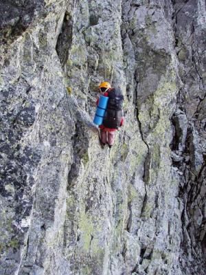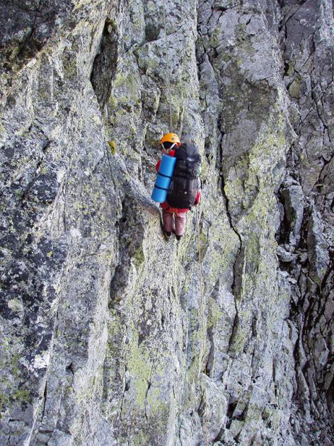 Tři dvojky lezeme po úzkém hřebeni celý den. Místy absolvujeme odstrašující nejištěné sestupy, při kterých stydne krev v žilách především druholezcům.