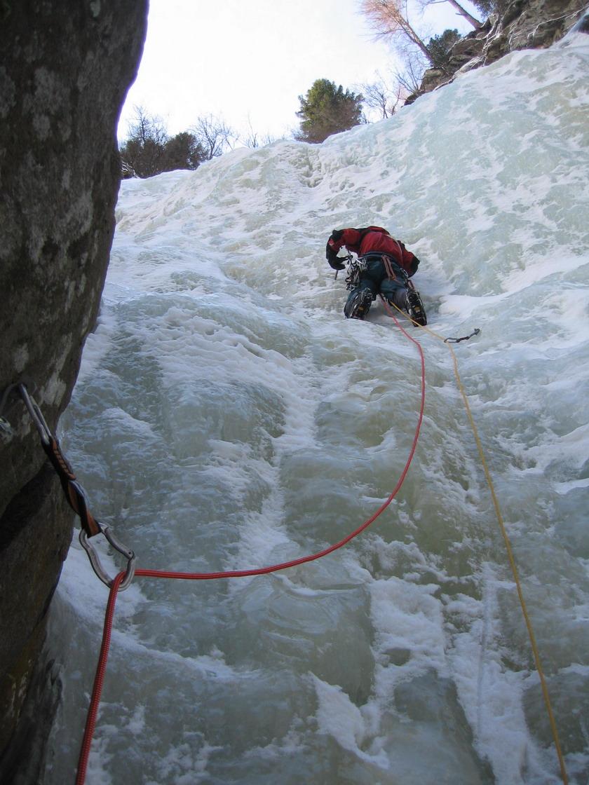 Když jsme nalézali do první délky, přišla zrovna skupina Italů a nějací češi. Italové se dělí na tři skupinky, jedna dvojka leze nalevo od nás docela rychle. Když slaňujeme, jsou už téměř nahoře. Ale třetí, trojčlenná skupina je teprve asi v jedné třetině ledu a to už jsou asi 3h odpoledne. :o)