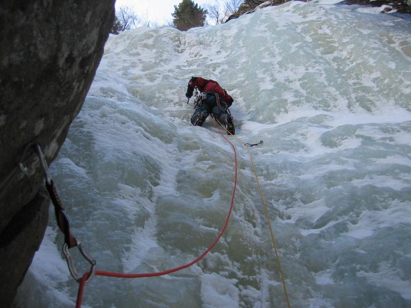Když jsme nalézali do první délky, přišla zrovna skupina Italů a nějací češi. Italové se dělí na tři skupinky, jedna dvojka leze nalevo od nás docela rychle. Když slaňujeme, jsou už téměř nahoře. Ale třetí, trojčlenná skupina je teprve asi v jedné třetině ledu a to už jsou asi 3h odpoledne. :o)