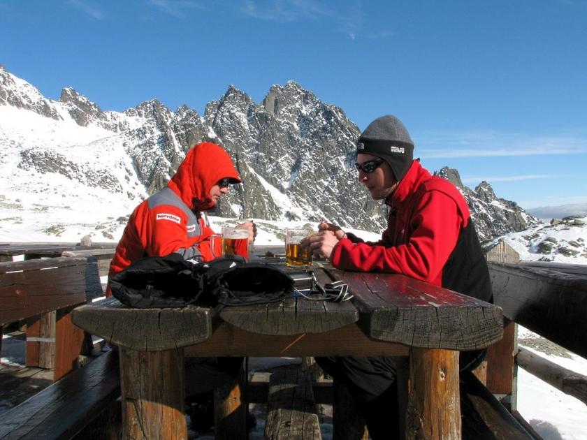 V utery rano bylo opet hezky, teplota jen lehce pod nulou, chteli jsme s Martinem neco lehciho a tak jsme se vydali SZ rokli na Slavkovskou kopu. V poledne jsme jiz stali nahore na vrcholu a rozhodli se jeste prejit Vareskuv hreben do Slavkovskeho sedla. Pruvodce psal 1,5h, no nejak jsme to sli skoro 3. Gobo s Mastou jdou JV hreben na Vychodnou slavkovskou vezu. Celou dobu je mame na ocich, potkavame se ve Slavkovkem sedle a vychutnavame si sjezd do dolinky nad Vareskovym plesom.