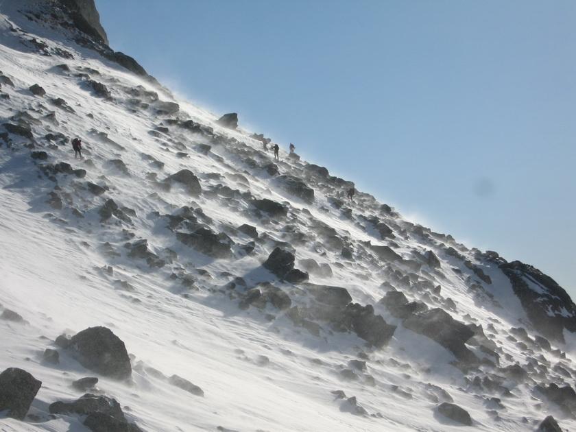 Pondelni rano vypadalo lepe, snad jen ten vitr... No okusili jsme ho nakonec az az. Vydali jsme se puvodne na hreben Ostreho stitu od Sneznej lavky, no malem odfouknuti pod nastupem jsme zmenili plan na Komarnickych rokli na Sirokou. No vyhra to nebyla. Z modre oblohy ficel ostre snih a neochvejne bodal do odkrytych casti obliceje. Snih ficel shora, ficel z boku, ficel zespoda. V Komarnickych rokli se nas seslo opet par humanitnich kousku. Gobo s Mastou, Verca, Kristyna, Vita, Kuba, Jenik.. No a jeste teda ja s Martinem. Gobo lezl uz nekde nahore před koncem rokle, ale fronta i tak pekna. Masta s Vercou se navazali každý na jedno lano za Gobem, Kuba tahal delku pro Jenika, Vitu, par metru za Kubou jsem vyrazil ja tahat delku Martinovi a na spagatu za Vitou jeste pod previsem v pulce rokle, kde jsme vsichni zacali jistit, cekala Kristyna. Takze mumraj. Ficelo tak, ze i vetsi kusy snehu a ledu, ktere jsme cistili z cesty, letaly kolem nas nahoru, místo dolu rokli. Jednim slovem: "neprijemne". :) Gobo s Vercou a Mastou jiz zmizeli na vrcholu Siroke, ja s Martinem jsme je jiz také volne nasledovali, kdyz Vita zacinal na standu jistit poslední Kristynu. Kuba rozhodl, ze oni to dolu slani. Vylezli jsme na vrchol , presli jej a sestoupili do Priecneho sedla, obesli Sirokou az pod jeji levou hranu, kde jsme rano nechali sneznice. Kuba se svou druzinou zatim nikde... Nakonec dorazili asi 2h po nas. Proti gustu zadny disputat.. :) Cesta na chatu proti vetru byla jeste take zajimava, misty jsem sel i nekolikero kroku radeji se zavrenyma ocima, bodajici snih si nedal pokoj... [tu mi dosla baterka na PDA, takze zbytek uz jen narychlo a kratce dopisuji doma]