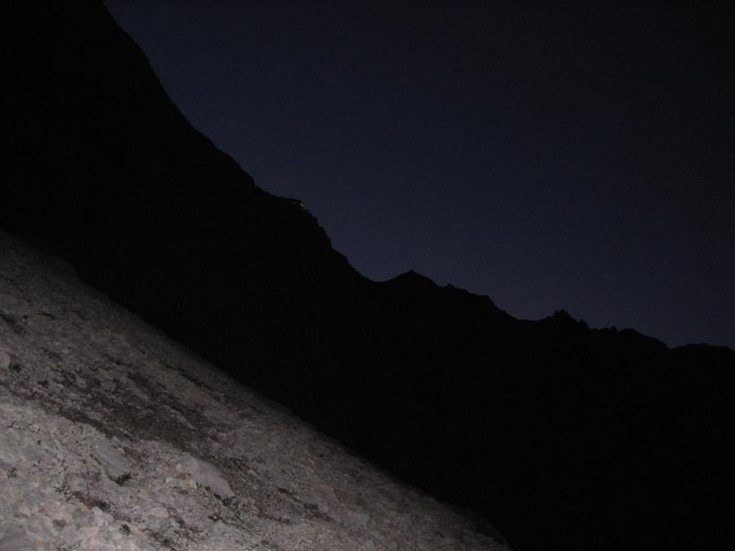 Na nástup docházíme spolu s Gobem. Ne že bychom Gobovi stačili, ale ten si z nudy udělal drobnou zacházku na nástupu. Už teď je jasné, že nás ve stěně bude dost. Po cestě jsme ještě za tmy zahlédly čelovky jedné dvojky na nástupu, a teď za námi vidíme dalších osm lidí. Před firnovým polem na sebe navlékáme úvazky a matroš, a volně přecházíme firnové pole. Po chvilce dvojkového lezení jsme na začátku cesty. Chvíli po Gobovi vyráží nějaký vůdce, klientem se moc nezabývá. Po skále spíš běží než leze, klientu ho nejistí, jen mu podává lano. Samozřejmě jen jedno, dvojčata nebo půlky tady mají snad jen češi. Za námi je ještě jedna rakouská dvojka a čtveřice čechů.
