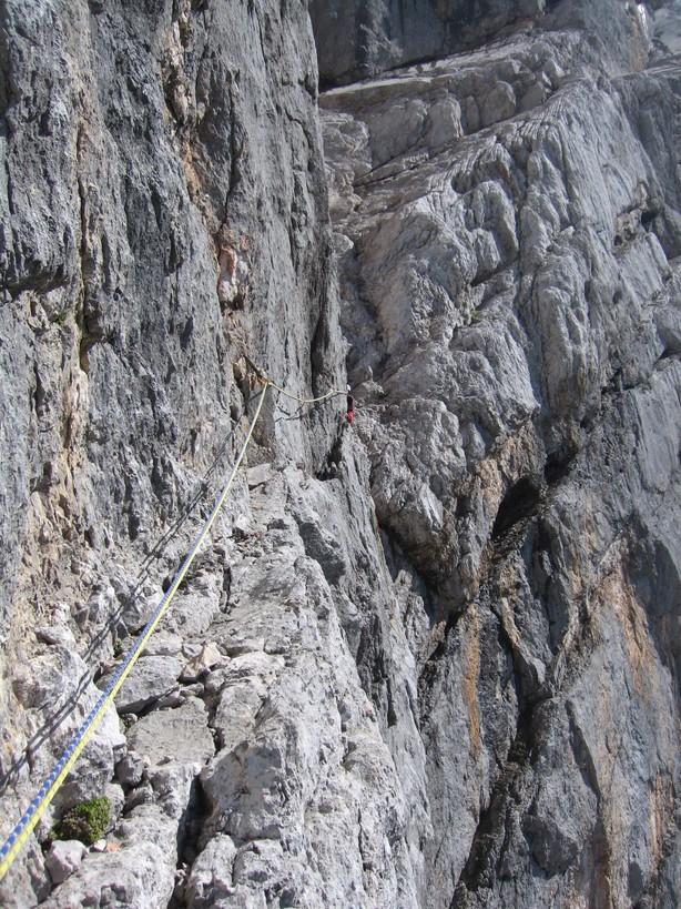 V prvních pár délkách se různě motáme s rakušákama, češi lezou asi délku za námi. Takto dolézáme až na Plattendach. Po něm se 1-2 terénem opět dostáváme k lezení. Mám pocit že se najednou odevšaď vynořilo spoust dalších dvojek a trojek. (Že by snad lezli Hazardline (8)?) Vzdávám počítání lidí ve stěně a jen se nějak snažím nezamotat do té spousty lan. Také to konečně vypadá, že polezeme na sluníčku. Prej jižní stěna, a zatím to byl jen samej stín.