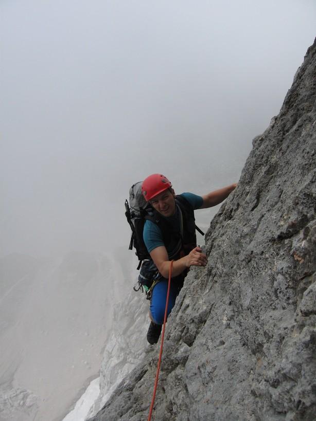 Hmm, to už jsme někde v klíčovém místě. Kupodivu je to spárokoutokomín. Jako bonus převislej a možná i trochu mokrej. Gobo ho na prvním nějak přeběhne. My s Jindrou se v něm trochu s batohem trápíme. Nad komínem už je to nuda, teda kromě dvou míst, které Gobo nechce oblézt. Začne to být taky trochu orintačně náročnější. Cestu nám zpestří ještě dva "basejumpři", kteří okolo nás proletí. Teda "basejumpři", tihle letí v naší výšce projistotu bez otevřeného padáku, který snad otevřou až někde dole. Jak v té stometrové viditelnosti poznají, kde je dole, mi zůstává záhadou.