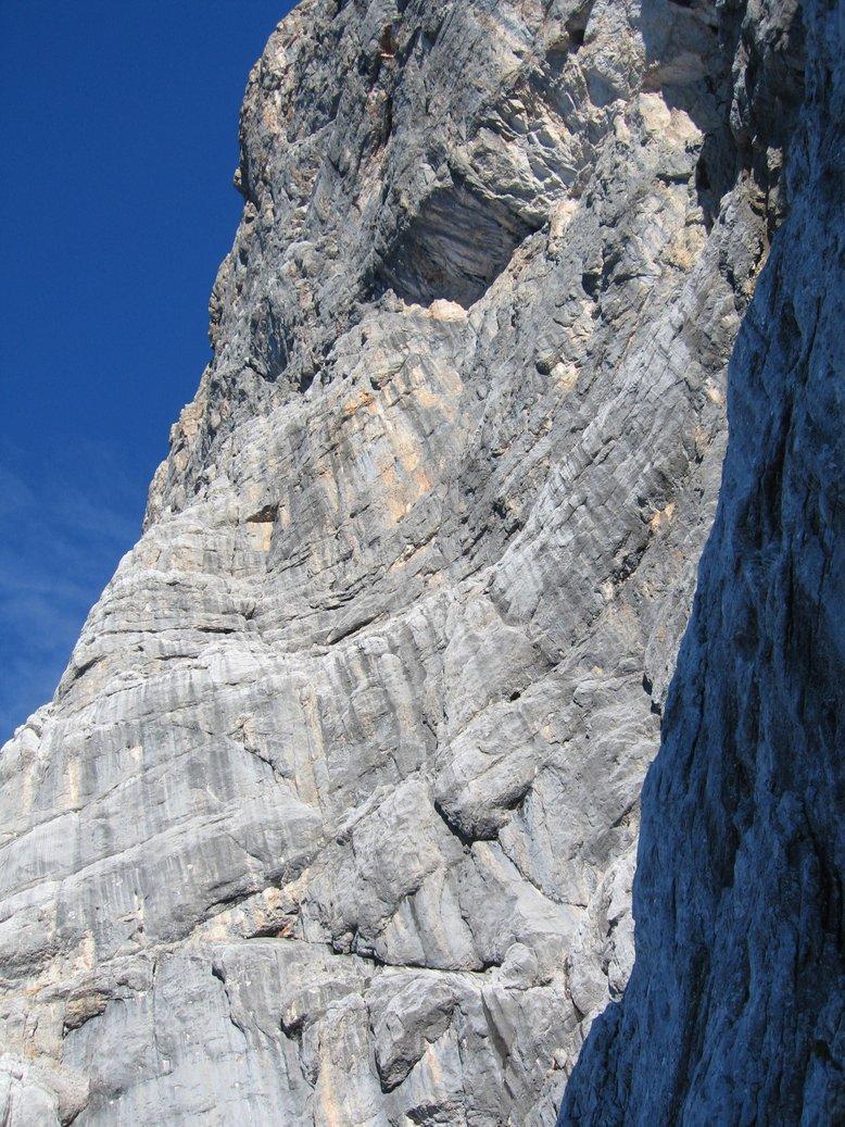 V prvních pár délkách se různě motáme s rakušákama, češi lezou asi délku za námi. Takto dolézáme až na Plattendach. Po něm se 1-2 terénem opět dostáváme k lezení. Mám pocit že se najednou odevšaď vynořilo spoust dalších dvojek a trojek. (Že by snad lezli Hazardline (8)?) Vzdávám počítání lidí ve stěně a jen se nějak snažím nezamotat do té spousty lan. Také to konečně vypadá, že polezeme na sluníčku. Prej jižní stěna, a zatím to byl jen samej stín.