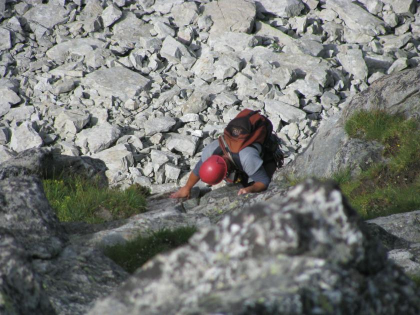 Balíme věci. Podaří se mi zabalit do jednoho baťohu. Kluci mají 2. Milanovi a Martinovi se ten menší podaří připevnit na ten velký, Petr ho nesen na břiše. Počasí je jak z reklamního letáku, avšak k pochodu do kopce s bagáží není právě nejvhodnější. Jdeme k chatě Sciora (2118 m n. m.). Chatu míjíme obloukem. Setkat se s místním chatařem prý není radno. Už je na tom tak špatně, že na stanovánímilovné horolezce chce volat policii. V suti hledáme vhodné místo pro naše stany. Směr který jsme zvolili se neukázal nejlepší. Chůze v suti s krysou na zádech je nepříjemná a namáhavá. Já a Martin se vydáme na průzkum na lehko. Nakonec najdeme plácek, kde se dají postavit 2 stany. Kus nad námi už jeden stan stojí a za potůčkem bivakuje nějaké děvče. S Petrem stavíme stan, kluci spí venku.