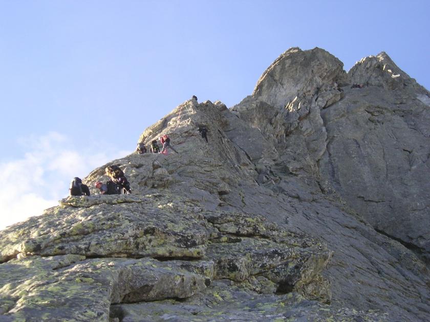 Je tma, zima a cosi mi pípá u hlavy. Kluci zase zdržují - ještě vaří ranní čaj a snídají. Balíme stany, oblékáme sedáky, bereme připravené baťohy a vyrážíme vzhůru do tmy, kde už se klikatí had čelovek. Dalšího hada vidíme pod námi, lezci z chaty Capanna Sasc Fura (1904 m n. m.) vyrazili. Nástup je po hladkých ukloněných plotnách. Místy jsou mokré. Jdeme volně v pohorkách až na plošinku, kde se řada lezců navazuje. Nevypadá to těžce, takže ještě 1,5 dálky jdu volně. Kluci ujdou volně jen délku, pak se začnou jistit. Čekám na Petra u nýtu, navazuje se s klukama a doleze ke mně. Mezitím nás předbíhají asi 2 družstva. Na dalším štandu vše přeuspořádáme a vyrážíme na stíhací závod. Leze se paralelně, lezci cvakají jištění jiných družstev. Jednu pěknou rajbákovou délku, která vyšla na Petra lezou 4 družstva souběžně. A co je vidět na štandech!? Pit Schubert by o tom mohl vydat knížku "Bezpečnost a riziko na severní hraně Badile". Nezbývá než na tu hru přistoupit a vystrčit hodně špičaté lokty, jinak se nikam nedostanete. Odhaduji, že zde leze kolem stovky lezců. V jednom místě ani nevím v kolikáté délce se had zastaví. Je zde úzký průchod komínem. Za tímto místem už je to o něco lepší, ale s předbíháním se setkáváme až do konce. Kluci za námi trochu zaostávají. Ale v jednom místě asi tak na 2 délky kufrujeme. Petr si tak užije zajímavého lezení a Martin s Milanem se k nám zas přiblíží na dohled. Na jeden ze štandů dolézá Petr značně zadýchaný, nabízím mu že to dolezu na prvním, čehož využívá. Posledních asi 7 délek dolézám já. Těžší jsou jen 3 z nich, pak se cesta mění v položený hřebínek, takový co lezeme v zimě v Tatrách. Expozice je parádní! Ještě, že je mlha, jinak bych se asi bál. Přesto, že už lezeme skoro vodorovně, stále štandujeme. V každé délce se totiž najde nějaké vypečené místo, kdy musíte slézt dolů a pak zas nějakým těžším místem nahoru. Předvrchol míjíme z leva. Místy se už jde, v malé štrbině odpočíváme a čekáme až odlezou družstva před námi. Pokračuji dál. Lehkým lezením se dostanu do chodeckého terénu a když vykouknu za roh, koukám na vrcholový tripól. Bohužel se nám poněkud zamotala lana, takže poslední délka nám zabere asi půl hodinu. Je 15:15 a jsme na vrcholu. Petr si jako správný dobrodruh zapálil Camelku - "zlepšuje to dýchání". Kluci dorazí v 17 hodin. Za tu dobu vyfotíme několik družstev u tripólu, některým i poradíme, kde začíná sestup a pěkně vykosíme. Začneme sestupovat, na sestupu je zase zácpa. Družstva, která začala sestupovat hodinu před námi trčí o 2 slanění níže. A tak na různých policích postáváme nejméně hodinu. Co tam pod námi vyvádějí nechápu. Teda vlastně chápu, jen nerozumím tomu proč do takové cesty jdou lidé, kteří neumějí svázat 2 lana na slanění. Na širokém pásu se zácpa jako mávnutím kouzelného proutku rozplyne a před námi už nikoho ani nevidíme. Přejdeme na konec pásu a pokračujeme ve slanění. Mám dojem, že tama kde je v průvodci napsáno "NO". Ale dole zahlídnu ještě nějaké lidi, takže se tudy dolů dostaneme. Hned první slanění je dobrodružné. Visí zde totiž 2 fixní lana. Jedno má v půli uzel, takže volím to druhé. Při slanění vydává divné zvuky a navíc nevede až k dalšímu slanění. Takže sjedu pod ten uzel a přesednu na to druhé lano. Pak už slaňujeme po vlastních lanech. Na konci nás čeká krátký traverz sněhovým polem k dalšímu fixu. Ten překonává strmou část sněhového pole a dovede nás na rovnější úsek kousek od suti.