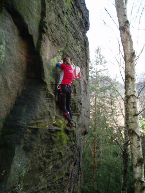Směr 18. Hele novej průsek, to je jak dálnice k 54. Jen do kopce, ale vyplatilo se. Hurá zase na 18, má tam být info o bonusovce. No to si dělaj prdel slaňovat z téhle břízky. "Hele kolik vážíš", v duchu se ptám holky předemnou. "55?" Tak těch 30 navíc to snad zvládne. Bonusová 605m daleko. "A co hledáme." "Já nevim, asi vršek, sem si to zapoměl přečíst." "Tak uvdíme." Fuj, naštěstí je to na tringulanci. Zpátky k lezeckejm.
