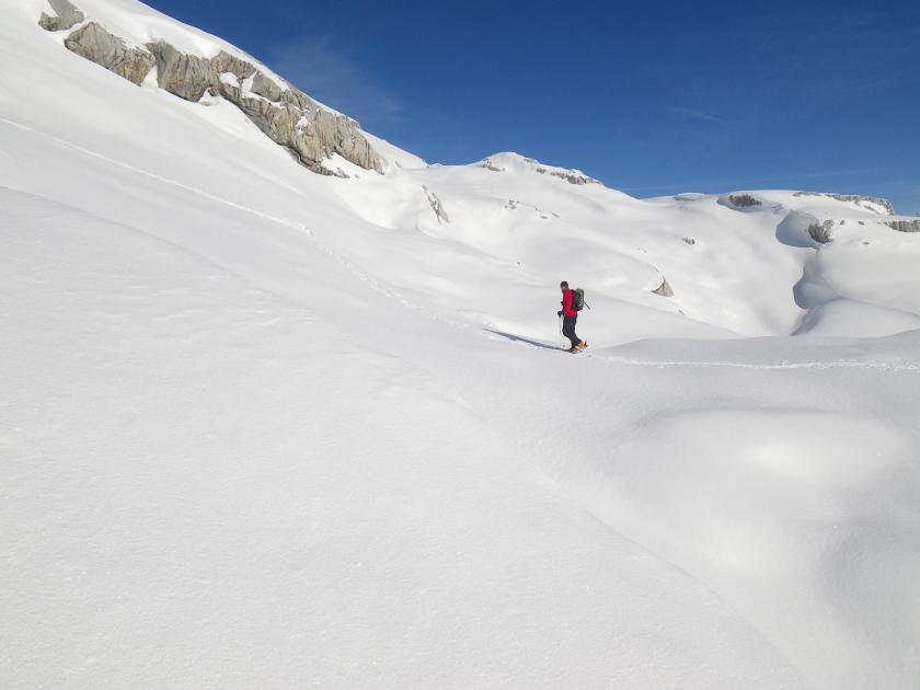 Po dlouhé debatě kudy dolů, které probíhala prakticky celý včerejší den, se cestou kolem Elmu vydáváme do údolí. Přes hordy menších a větších boulí nahoru, dolu, okolo. S pásama, bez pásů, nebo i bez lyží. všechny varianty na prd, takže si pěkně procvičuji slovník sprostých slov. Nejdříve potichu, později nahlas. Intenzita nadávek graduje poté, co na mě mává Omarak, kdesi v lese vpravo ode mne a doporučuje zkratku. Když se hrabu ze třetího závrtu musí mě už slyšet celé údolí.