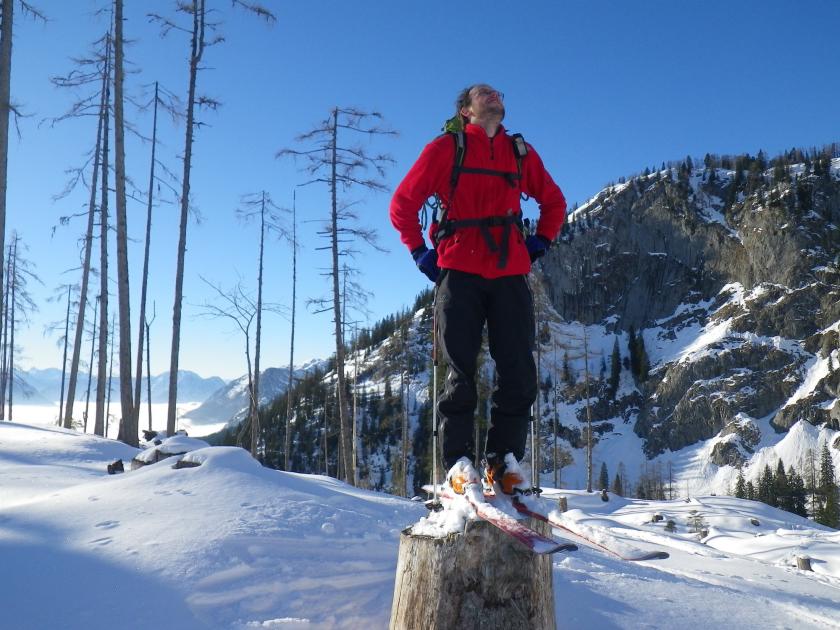 Po dlouhé debatě kudy dolů, které probíhala prakticky celý včerejší den, se cestou kolem Elmu vydáváme do údolí. Přes hordy menších a větších boulí nahoru, dolu, okolo. S pásama, bez pásů, nebo i bez lyží. všechny varianty na prd, takže si pěkně procvičuji slovník sprostých slov. Nejdříve potichu, později nahlas. Intenzita nadávek graduje poté, co na mě mává Omarak, kdesi v lese vpravo ode mne a doporučuje zkratku. Když se hrabu ze třetího závrtu musí mě už slyšet celé údolí.