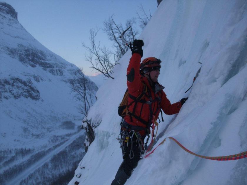 Lezení ve zdejším ledu nemá obdoby. Je to něco nepředstavitelného. Přenádherně nateklé ledopády nejrůznějších tvarů a délek jsou pro nás velikou výzvou. S úžasem vždy provádíme první záseky do ledu a pochvalujeme si zdejší kvalitu "jo to Norsko". Pohybujeme se většinou v obtížnosti WI3-4+. Píťa jako správný instruktor předává cenné zkušenosti a stoupá vzhůru jak pára nad hrncem metr po metru. Užíváme si lezení přes den, tak i lezení v noci za svitu polární záře, měsíčku a čelovek.