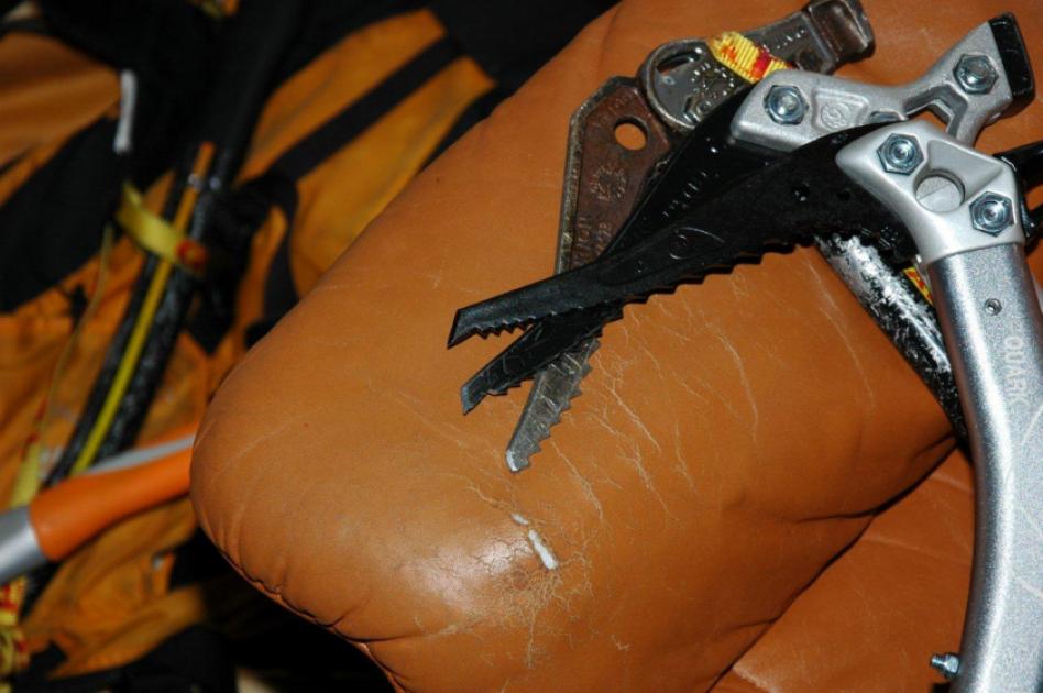 Mé cepíny značky Petzl Píťa zabavuje, řka, že jsou pro mne, začátečníka, moc ostré, podávajíc mi své dvě "Lípy" značky Grivel.