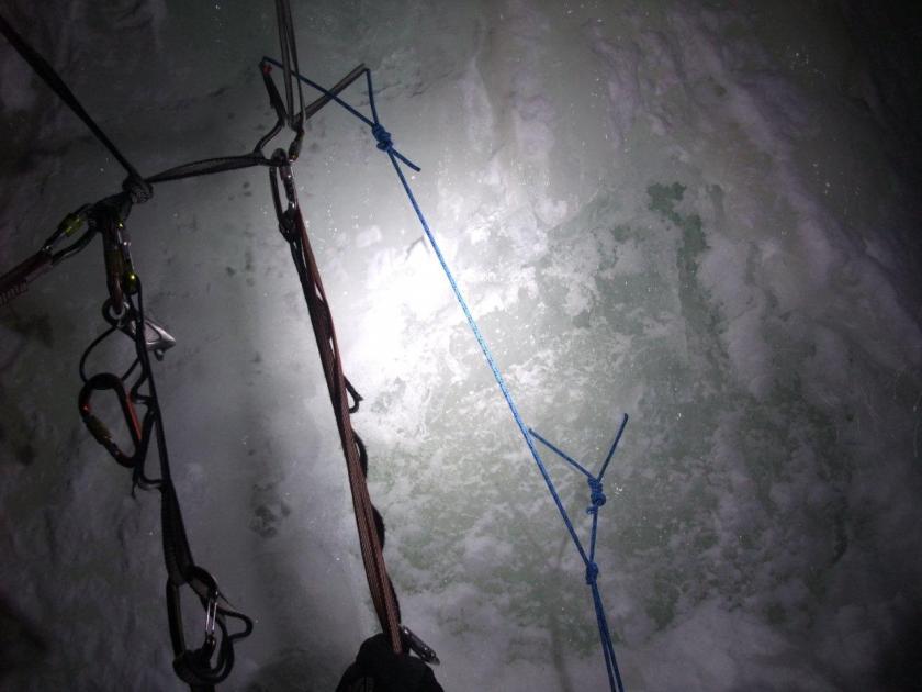 Nástupy na ledy jsou plné sněhu, postupuji radostně vpřed. Píťa jako zkušený lavinolog čas od času znejistí divným zapraskáním ve sněhu. I přes sebevětší opatrnost se jednou ve druhé délce projíždí malou lavinou (tentokrát jištěn spolulezcem).