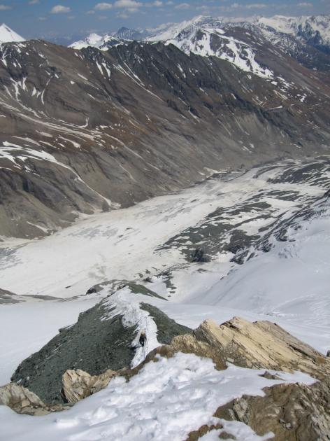 Sestup je místy pěkně exponovaný, hlavně přes sedélko mezi oběma vrcholy. Sněhová návěj je ušlapaná, ale lávka dlouhá asi tři metry je uprostřed široká asi jen 30 centimetrů. Opatrně přecházím, ke konci spíše přeběhnu. :) I přes Klein Glockner je to ještě hezká expozice, pak už se slézá celkem v pohodě, sem tam se musíme vyhýbat s ostatními, mířícími nahoru. Za hodinku (v jednu odpoledne) dorážíme na Erzherzog Johann Hütte (3454m), kde sundáváme sedáky a helmy a balíme do batohů. Dál sestupujeme po snehových pláních, je to hezky z kopce a sníh se moc neboří, tak kde to jde, zkoušíme sjezd po zadku. Docela se to daří a končí to několikasetmetrovým sjetím posledním žlabem až dolů na ledovec v údolí. Paráda, není to ani hodina a už jsme dole, myslel jsem že nám to zabere i tři hodiny. Sundáváme mačky a docházíme na konec ledovce k serpentinkám pod parkovištěm. Tam na nás čeká Masťa s Peťom. V sobotu nahoru na parkoviště nešli, ale přespali tu dole. Takže ještě vyfunět těch 200 výškových metrů na parking. Jdu pomaličku, noha nohu mine, už není kam spěchat a ještě chceme dojet zpátky do Prahy, tak at se na konec moc nedorazím. :) Nahoře se ještě chvíli hřejeme na sluníčku, balíme, převlékáme, sušíme a hurá na zpáteční cestu.